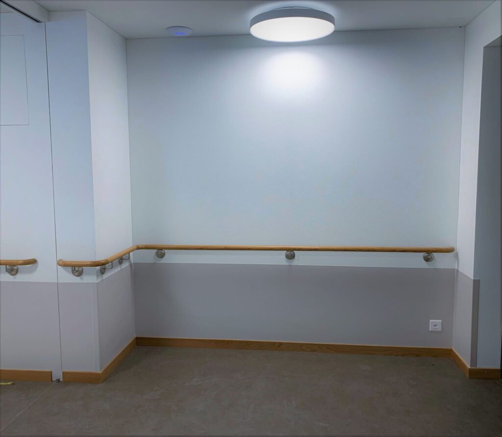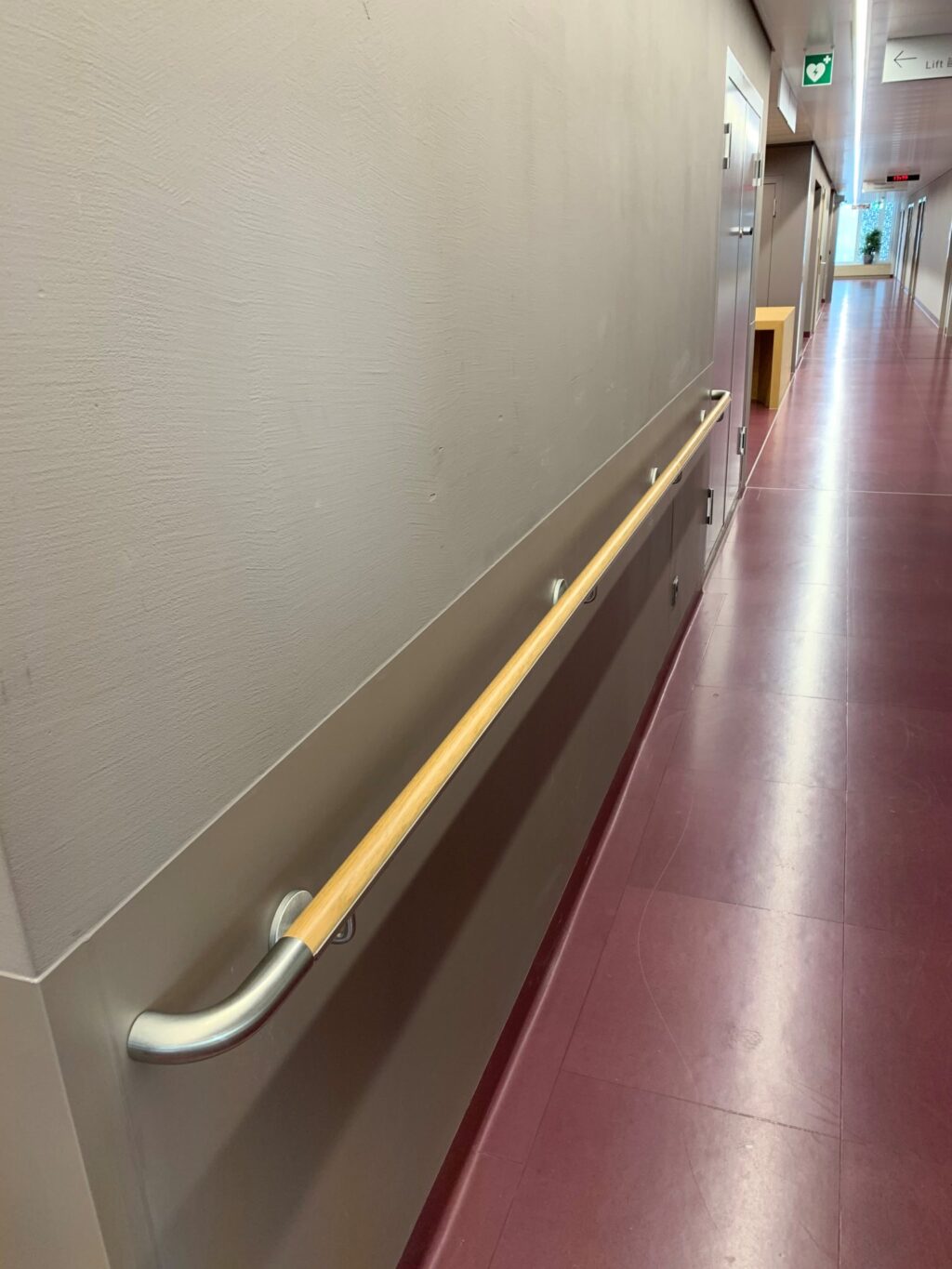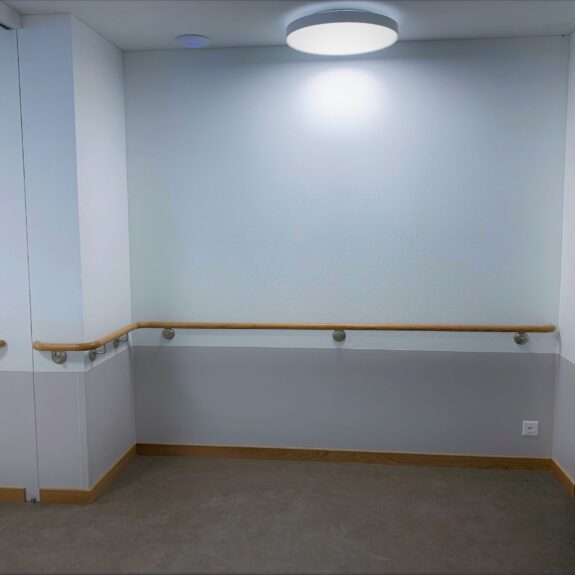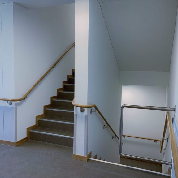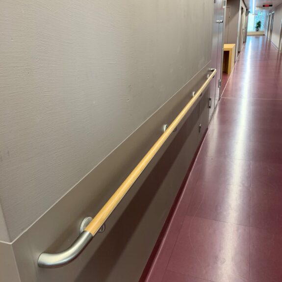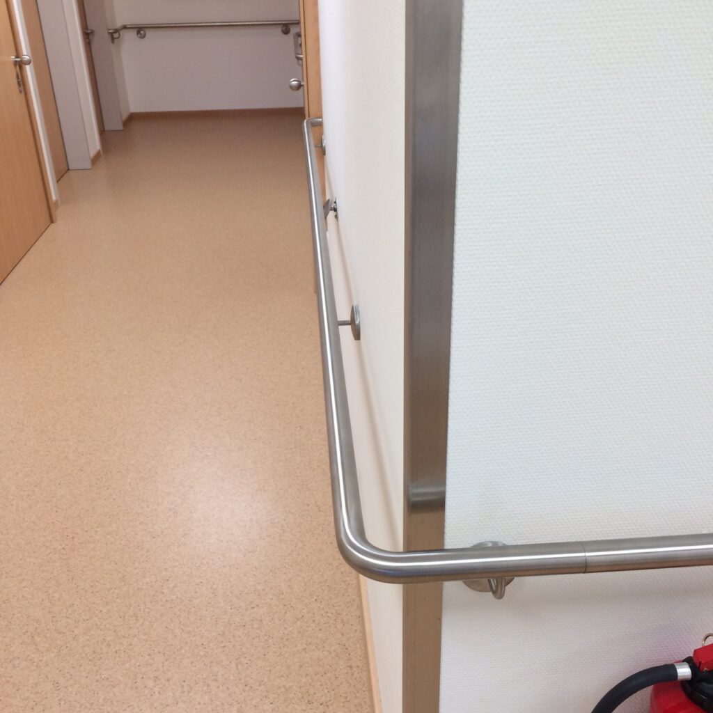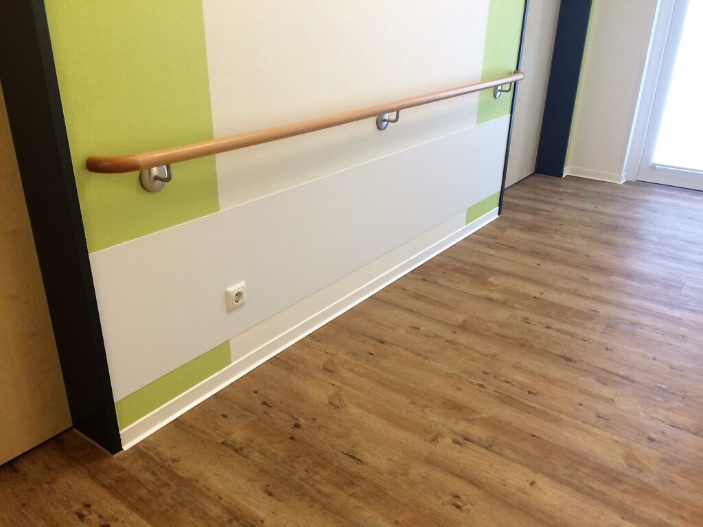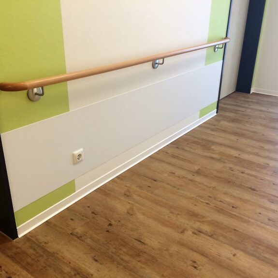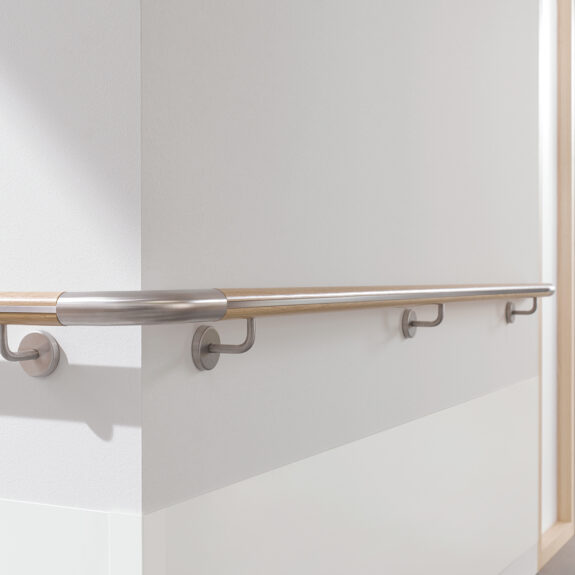 Das Holzhandlaufsystem Lignum Protect verfügt über einen integrierten Rammschutz. In das Holz ist ein Streifen aus extrem strapazierfähigem Material eingearbeitet. Dieser schützt den Handlauf vor Beschädigungen durch Stöße. Das Schutzprofil ist wahlweise aus HPL (High Pressure Laminate) oder aus Edelstahl erhältlich. Beide Materialien zeichnen ich durch äußerste Robustheit aus. Sie halten höchster Beanspruchung stand und sind formbeständig. Die Holzoberfläche ist mit einem reinigungs- und desinfektionsmittelresistenten Lack versiegelt und hierdurch ebenfalls äußerst robust. Das Handlaufsystem Lignum Protect bietet hohen Schutz vor Beschädigungen durch Stöße und eine wohnliche Anmutung gleichermaßen.