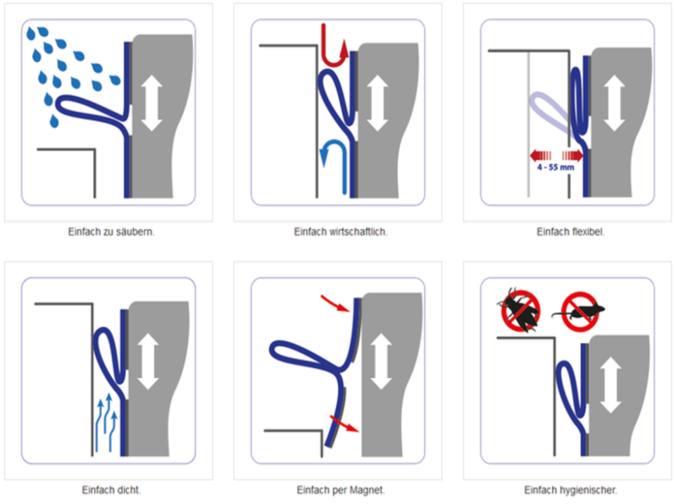 Statt Bürstendichtung oder Gummidichtung: der bessere Hygiene-Schutz, Energiesparer und Zugluftstopper. Einfach montiert mittels Magnet.