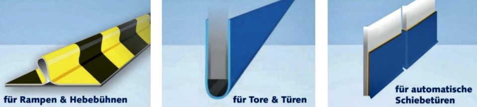 Spaltabdichtungen sind die langlebige Möglichkeit, Spalten an Türen und Toren in Industrie, Handel und Gewerbe abzudichten. Sie bestehen aus einem hygienischen, wasserfesten Spezialgewebe mit äußerst robuster und glatter Oberfläche. An einer oder zwei Längsseiten ist das Spezialgewebe mit Magnetbändern versehen, die für eine kinderleichte Montage sorgen. Ganz gleich ob Ladebrücke, Rolltor, Falttor oder Sektionaltor, Tür oder automatische Schiebetür – die Spaltabdichtungen sind mit ihren vielen Vorteilen im Handumdrehen angebracht. Sie schließen – anders als herkömmliche Bürstendichtungen oder Gummidichtungen – Spalten von 4 bis zu 55 mm stufenlos und zugluftdicht ab.